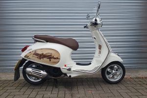 This 2019 Vespa Primavera 125 has only 8,472 miles and comes fitted with a genuine fly screen. Featuring unique WWII aircraft artwork and a “Lest We Forget” emblem, the decals can be removed if desired. A stylish and well-maintained scooter, ready for its next adventure.